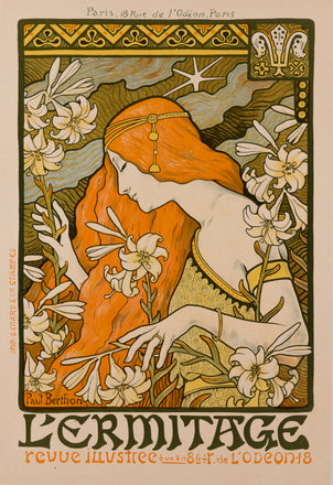 Not unlike the Maitres de L'Affiche series, L'Estampe Moderne was a portfolio printed between 1897-98, published by Imprimerie Champenois, Paris, contained 24 monthly portfolios, with four original lithographs in each. Each commissioned only for this series. Some of the contributing artists included Mucha, Rhead, Meunier, Ibels, Steinlen, Willette and Grasset.